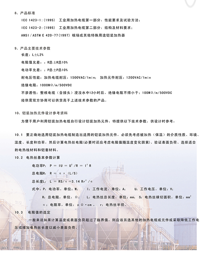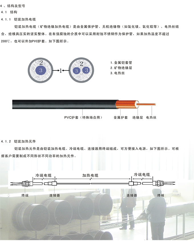 鎧裝加熱電纜(國外稱礦物絕緣加熱電模)是由金屬保護管,無機絕緣物(如氧化鎂,氧化鋁等),電熱絲組合,經模具壓實的整體,具有耐壓、耐高溫、可撓,高不滲透,耐輻射,高強度、安 全防爆、