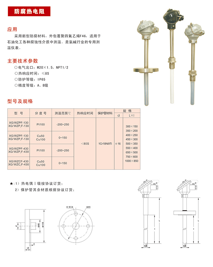防腐熱電阻,采用新型防腐材料,外包覆聚四氟乙烯F46,防腐熱電阻適用于石油化工各種腐蝕性介質(zhì)中測(cè)溫,是氯堿行業(yè)的專用測(cè)溫儀表。