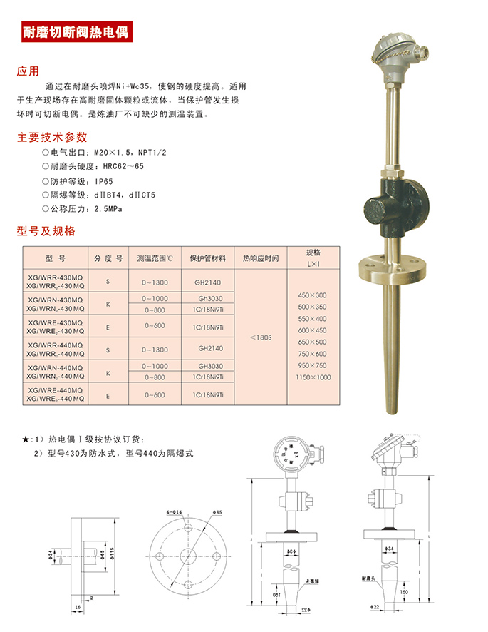 耐磨切斷閥熱電偶,通過在耐磨頭噴焊 Ni +Wc35,使鋼的硬度提高。耐磨切斷閥熱電偶適用于生產現場存在高耐磨固體顆粒或流體,當保護管發生損壞時可切斷電源,是煉油廠不可缺少的測溫裝置。