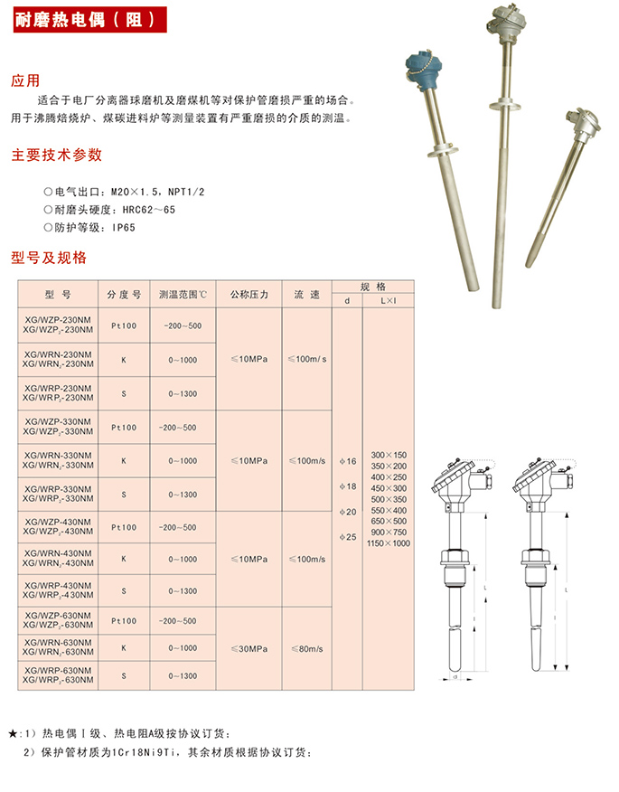 耐磨熱電偶(阻),適合于電廠分離器球磨機及磨煤機等對保護管磨損嚴重的場合。用于沸騰焙燒爐、煤炭進料爐等測量裝置有嚴重磨損的介質(zhì)的測溫。