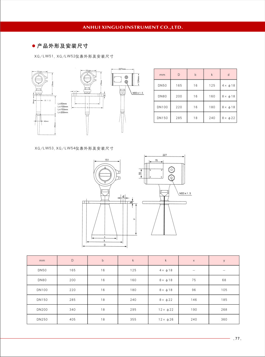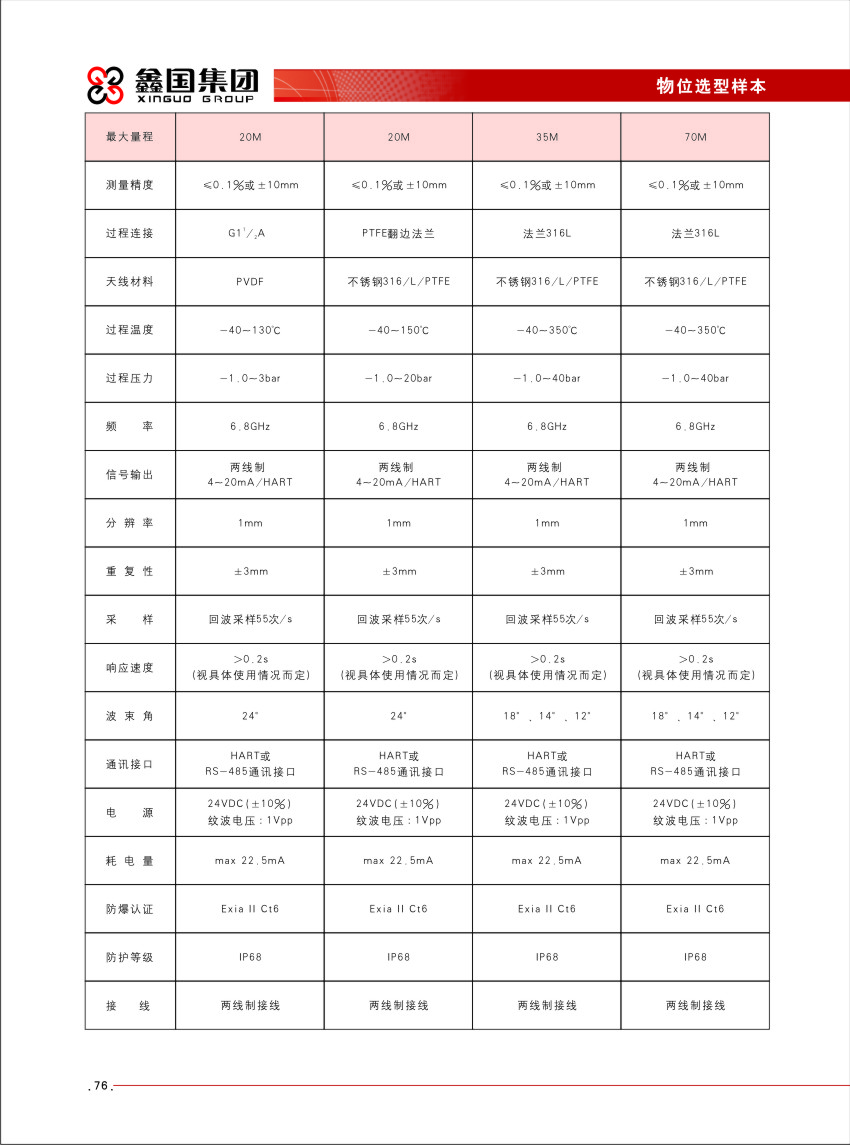 智能雷達物位儀, XG /LW5X系列雷達物位計是采用微波技術來檢 測料位的高科技產品,該物位儀利用微波具有穿透性好,對惡劣環境及被測物料適應性強等特點,采用世 界上先進的大規模集成電路,利用雷達原理,數字信號處理技術和快速傅里葉變換(FFT)技術。采用非接觸式連續測量,能測量液體、固體(塊狀、粉狀)料位,具有測距遠(70米),精度高,免維護等特點。